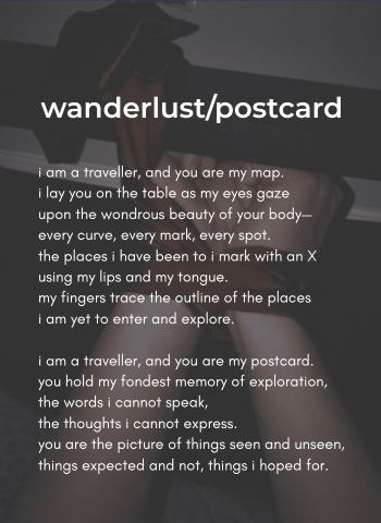 i am a traveller, and you are my map.i lay you on the table as my eyes gazeupon the wondrous beauty of your body—every curve, every mark, every spot.the places i have been to i mark with an Xusing my lips and my tongue.my fingers trace the outline of the placesi am yet to enter... Continue Reading →