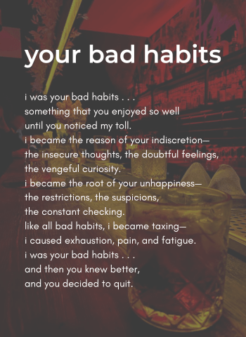 i was your bad habits . . . the things you knew you shouldn't have been doing and yet you have done them anyway. i was the sleepless nights you've had— tiring, demanding, regretful, yet indulging. i was those episodes of binge eating— impulsive, consuming, unreasonable, yet satisfying. i was the lies you told your... Continue Reading →
