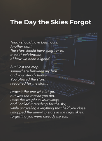 Today should have been ours.Another orbit.The stars should have sung for us:a quiet celebrationof how we once aligned. But I lost the mapsomewhere between my fearand your steady hands.You offered the stars;I reached for the storm. I wasn’t the one who let go,but was the reason you did.I was the weight in your wings,and I... Continue Reading →