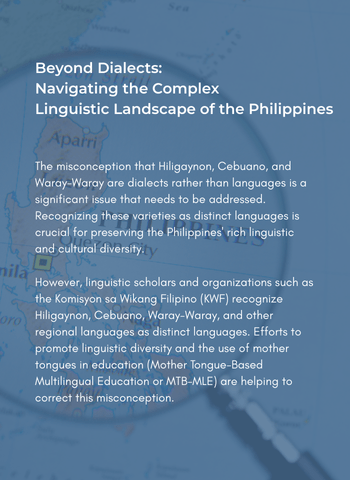A prevalent misconception among many Filipinos is the belief that Hiligaynon, Cebuano (Bisaya), and Waray-Waray, and many other regional distinct languages are mere dialects. This misunderstanding is perpetuated not only in everyday conversations but also within educational institutions across various levels.
