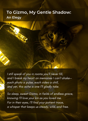 So sleep, sweet Gizmo, in fields of endless grace, knowing I’ll love your kin as you loved me. For in their eyes, I’ll find your patient trace, a whisper that keeps us steady, wild, and free.