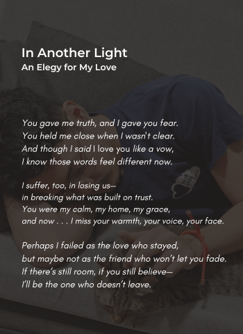 Still— my love for you was never pretend. It lived in me, from start to end. We faltered, yes, in moments dark, but even these ruin can't erase the spark.