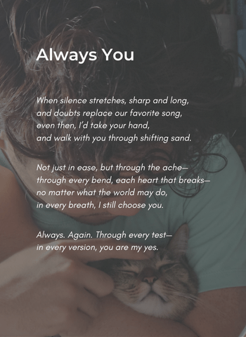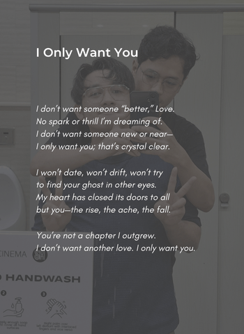 So here I am, my soul laid bare. If staying’s a war—I’ll wage it fair. You’re not a chapter I outgrew. I don’t want another love. I only want you.